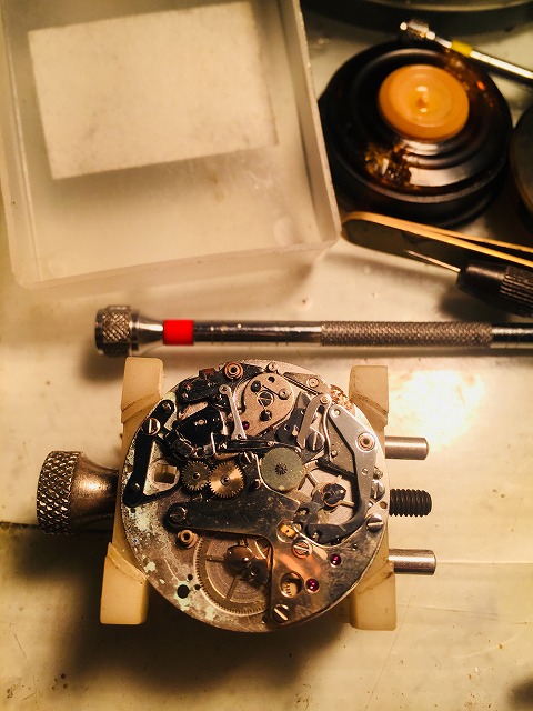 オーバーホール作業について簡単にご説明いたしますと、時計の状態を一通りチェックした後、部品を一つ一つ分解していきます。